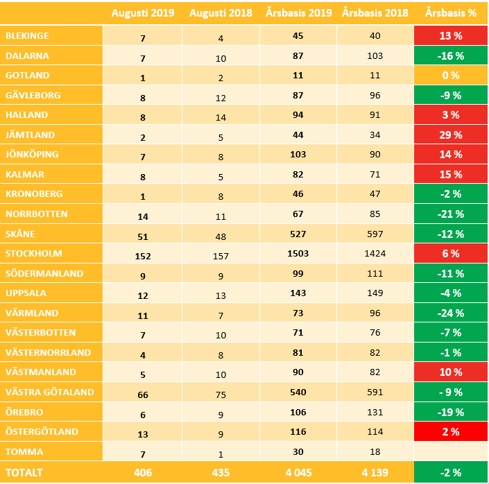 På årsbasis har 4 045 aktiebolag gått i konkurs i Sverige, vilket kan jämföras med 4 139 samma period förra året. Det är en minskning på två procent. Den genomsnittliga omsättningen på de konkursade bolagen under augusti var 5 miljoner kronor.