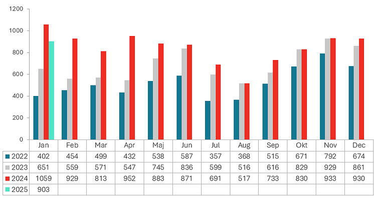 Under januari försattes 903 aktiebolag i konkurs, jämfört med 1 059 under samma period förra året. Trots en minskning på 15 procent är konkursnivån fortfarande hög sett till de senaste åren. Genomsnittet för januarimånad senaste tio åren är 528 konkurser. Minskningen i år beror främst på att januari 2024 var exceptionellt, med en ovanligt hög konkursnivå. Jämfört med samma månad 2023 har konkurserna ökat med 39 procent.