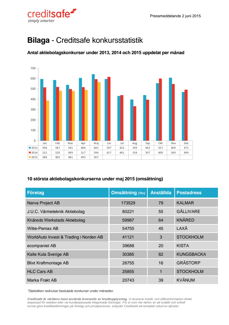 För konkursstatistik per den 2 juni 2015, se bilaga som omfattar: