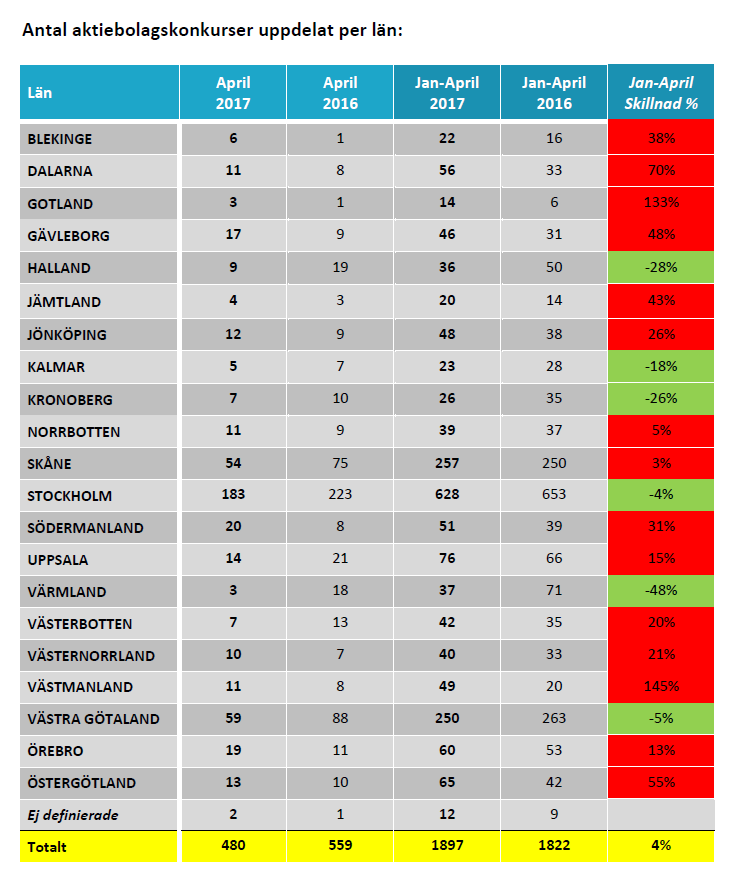 I april gick totalt 480 aktiebolag i konkurs, vilket kan jämföras med 559 samma månad förra året. Det är en minskning med hela 14 procent. Sett till de första fyra månaderna har konkurserna ökat med fyra procent i Sverige. Under januari till april gick totalt 1 897 aktiebolag i konkurs, vilket kan jämföras med 1 822 under samma period förra året.