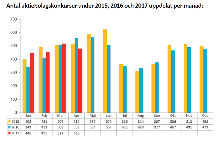 - Antal aktiebolagskonkurser under 2015, 2016 och 2017 uppdelat per månad