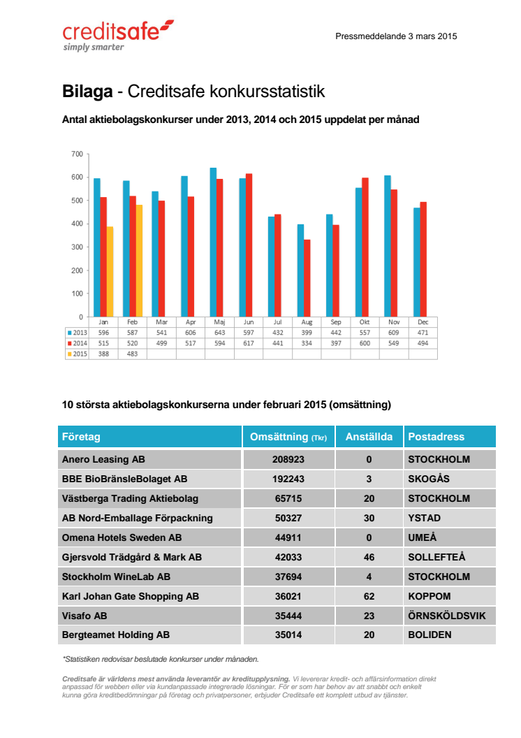 För konkursstatistik per den 3 mars 2015, se bilaga som omfattar: