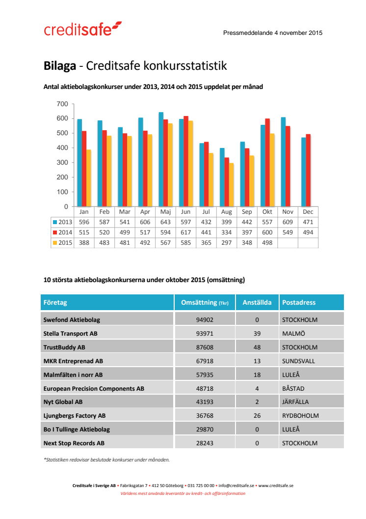 För konkursstatistik per den 4 november 2015, se bilaga som omfattar: