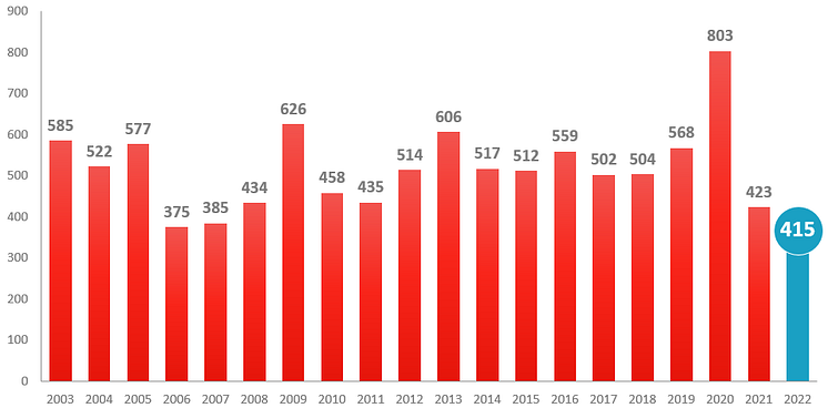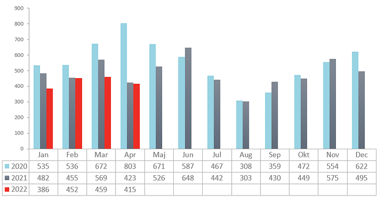 Under april registrerades 415 aktiebolag i konkurs, jämfört med 423 året innan. Medelvärdet senaste tio åren för samma månad är 551 konkurser, vilket ligger betydligt högre än dagens nivå. För två år sedan när pandemin först bröt ut gick hela 803 aktiebolag i konkurs under april.