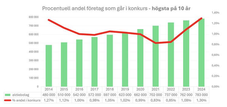 Sett till den totala mängden aktiebolag är andelen som går i konkurs den högsta sedan 2013. Under året gick 1,3 procent av Sveriges ca 780 000 aktiebolag i konkurs. Det kan jämföras med 1,08 året innan och 0,85 procent för två år sedan. Eftersom antalet aktiebolag nästan fördubblats under senaste tio åren, är det viktigt att analysera konkursutsatthet i relation till totala antalet företag.