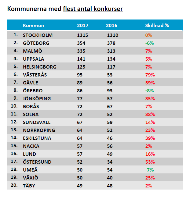 Sett till de större kommunerna i landet så har antalet konkurser ökat mest på Gotland, Västerås och Gävle. Kommuner som det gått bättre för och som kan visa en stark positiv trend är Karlstad, Örnsköldsvik och Nyköping.