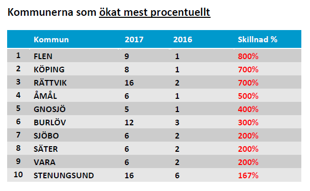 I botten på kommunlistan hittar vi Flen som gått från en konkurs till nio konkurser under 2017, samt Köpings kommun som ökat hela 700 procent senaste året. Även Rättvik har haft ett tungt år och gått från två konkurser till 16 konkurser under 2017.