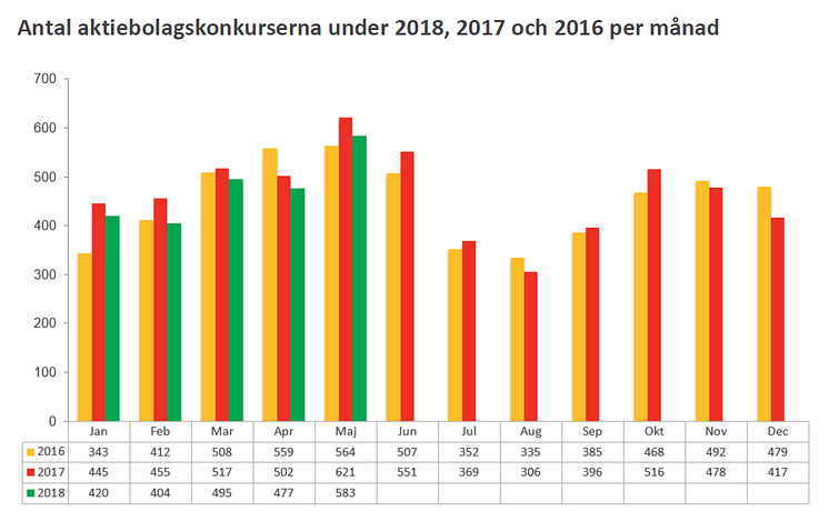- Antal aktiebolagskonkurser under 2016, 2017 och 2018 uppdelat per månad