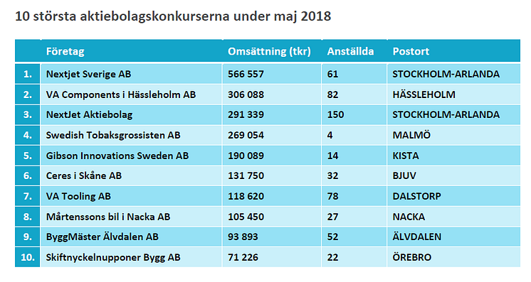 Denna månad försattes flera stora företag i konkurs. Hela åtta aktiebolag hade över 100 miljoner i omsättning. Största konkursen stod NextJet Sverige AB för, som tillsammans med dotterbolaget NextJet Aktiebolag, hade en omsättning på 858 miljoner och 211 anställda.