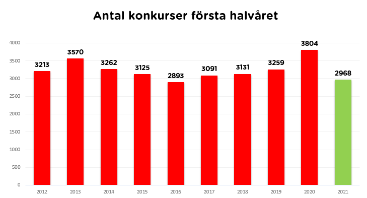 Konkurserna har nu minskat alla årets månader. Sammanlagt registrerades 2 968 aktiebolag i konkurs under första sex månaderna, jämfört med 3 804 samma period förra året. Medelomsättningen på företagen var 7,5 miljoner. Även antalet personer som förlorade sina arbeten till följd av konkurserna är lägsta på många år, totalt 7 286 anställda – jämfört med förra året en minskning med hela 45 procent.