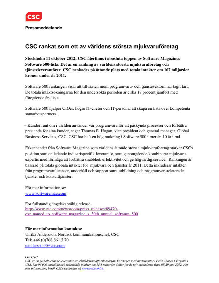 CSC återfinns i absoluta toppen av Software Magazines Software 500-lista. Det är en ranking av världens största mjukvaruföretag och tjänsteleverantörer. CSC rankades på åttonde plats med totala intäkter om 107 miljarder kronor under år 2011.
