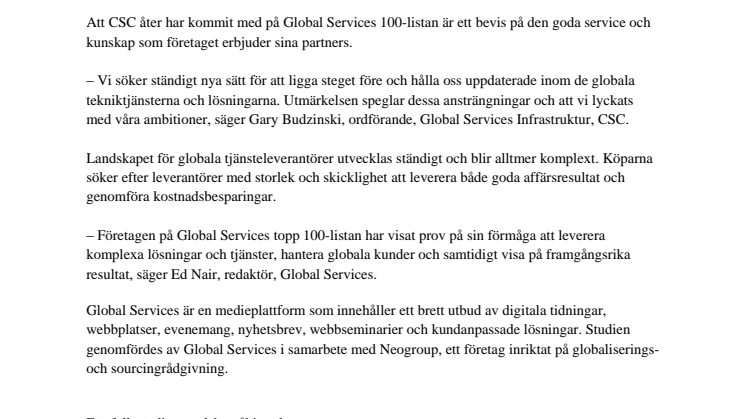 Att CSC åter har kommit med på Global Services 100-listan är ett bevis på den goda service och kunskap som företaget erbjuder sina partners.