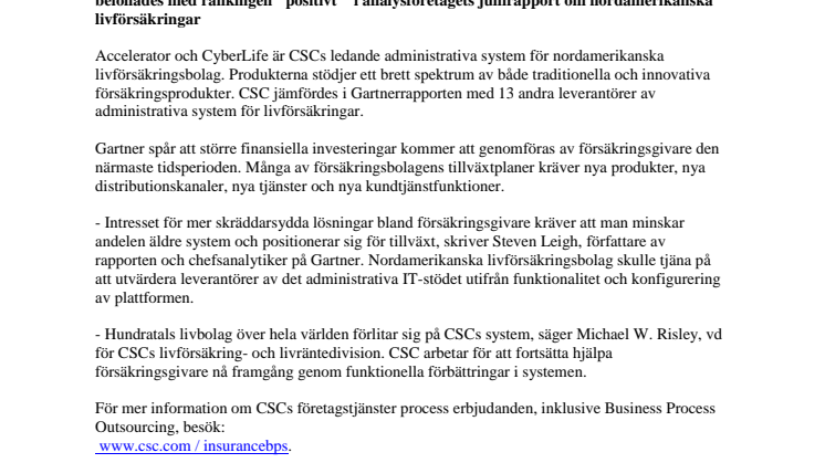 Stockholm 11 september 2012;  CSCs försäkringsprodukter Wealth Management Accelerator och CyberLife - mjukvaruprodukter för livförsäkring och leverantörer av livränta – har fått ett ordentligt erkännande av analysförtegat Gartner. CSCs produkter belönades med rankingen "positivt"  i analysföretagets junirapport om nordamerikanska livförsäkringar.