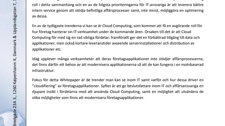 Cloud Computing är en del i ett betydande skifte på IT-marknaden. En Cloud-baserad infrastruktur har lägre driftskostnader och är mer flexibel än traditionell infrastruktur. Den globala konkurrensen och väntade bristen på arbetskraft är ständiga utmaningar för svenska företag. IT spelar en viktig roll för att öka effektiviteten och bevara konkurrenskraften.