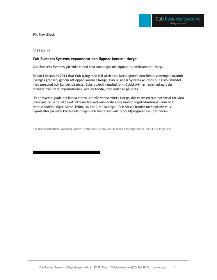 Cub Business Systems expanderar och öppnar kontor i Norge