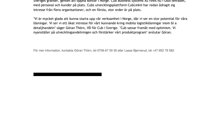 "Vi är mycket glada att kunna starta upp vår verksamhet i Norge, där vi ser en stor potential för våra lösningar. Vi ser vi ett ökat intresse för vårt kunnande kring mobila logistiklösningar inom bl a detaljhandeln" säger Göran Thörn, VD för Cub i Sverige. "Cub satsar framåt med optimism. Vi nyanställer på utvecklingsavdelningen och förstärker vårt produktprogram" avslutar Göran.