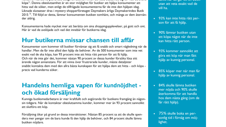Trots att kunderna själva kan söka upp all information på internet vill de ändå ha duktiga butiksmedarbetare som kan ge tips och rekommendationer. I samma undersökning svarar 85 procent att de hade kunnat spendera mer pengar än vad de tänkt sig om de träffat någon som kunde guida dem i butiken. Faktum är att det faktiskt bara var sju procent, 35 personer, av de obeslutsamma kunderna som svarat att de fick den hjälp och information som de ville ha.