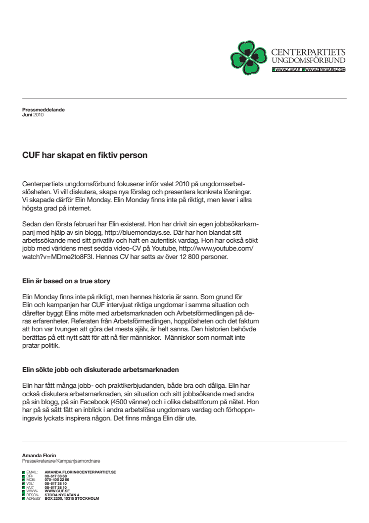 Centerpartiets Ungdomsförbund har sedan en tid tillbaka drivit bloggen bluemondays.se där Elin Monday, en fiktiv person, bloggar om livet som arbetslös ung i Sverige idag. Hennes video-CV har setts av närmare 13000 människor på Youtube.
