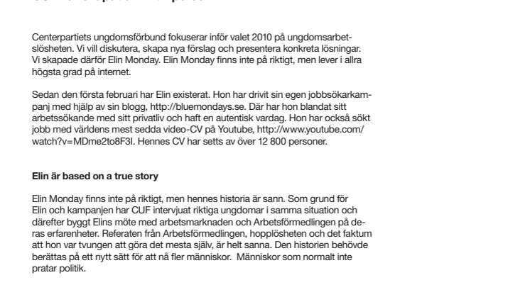 Centerpartiets ungdomsförbund fokuserar inför valet 2010 på ungdomsarbetslösheten. Vi vill diskutera, skapa nya förslag och presentera konkreta lösningar. Vi skapade därför Elin Monday. Elin Monday finns inte på riktigt, men lever i allra högsta grad på internet.