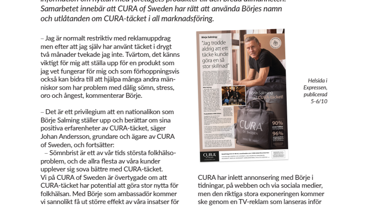 CURA of Sweden har initierat ett samarbete med Börje Salming för att sprida information om nyttan med företagets produkter till den breda allmänheten. Samarbetet innebär att CURA of Sweden har rätt att använda Börjes namn och utlåtanden om CURA-täcket i all marknadsföring.