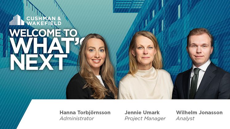 Hanna Torbjörnsson ansluter som Administratör till affärsområde Agency Leasing, Tenant Representation samt Project & Development Services och kommer tidigare från CBRE. Jennie Umark ansluter som Project Manager till affärsområde Project & Development Services. Jennie har flera års erfarenhet inom projektledning och kommer närmast ifrån Mercer Sweden AB. Wilhelm Jonasson anställs som Analyst till affärsområde Capital Markets efter att ha arbetat som studentmedarbetare sedan september 2021. Wilhelm kommer direkt från KTH där han till sommaren avslutar sina masterstudier inom Real Estate and Construction Management.