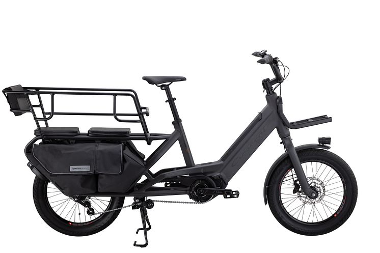 Longtail 20" elcykel för last och upp till två barn. Här med två väskor bak, sittkuddar och båge för två barn