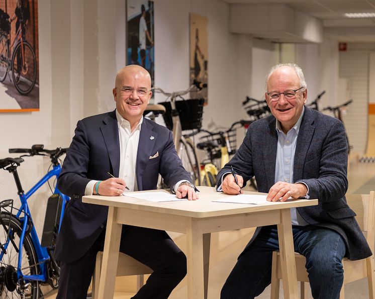 Cycleuropes vd Tony Grimaldi är ordförande för Cycling Industries Europe som är rösten för cykelindustrin i Europa och arbetar för att stärka cyklingen i både Europa och världen. I mitten av januari välkomnade han Henk Swarttouw, som är ordförande för cyklistorganisationen European Cyclists’ Federation, till cykelfabriken i Varberg, där välkända cykelmärken som Crescent och Monark tillverkas sedan många decennier. Det är ingen slump att samarbetsavtalet om Europas framtida cykelagenda skrivs på just här.