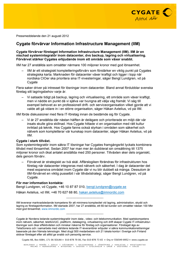 Cygate förvärvar företaget Information Infrastructure Management (IIM). IIM är en nischad systemintegratör inom datacenter, dvs backup, lagring och virtualisering. Förvärvet stärker Cygates erbjudande inom ett område som växer snabbt.