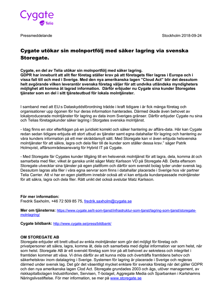 - Idag finns en stor efterfrågan på en juridiskt korrekt och säker hantering av affärs-data. Här kan Cygate redan sedan tidigare erbjuda ett stort utbud av tjänster samt egna datahallar för lagring och hantering av våra kunders information på ett mer skräddarsytt sätt. Med Storegate kan vi även erbjuda helsvenska molntjänster för att säkra, lagra och dela filer till de kunder som ställer dessa krav.” säger Patrik Holmqvist, affärsområdesansvarig för Hybrid IT på Cygate.