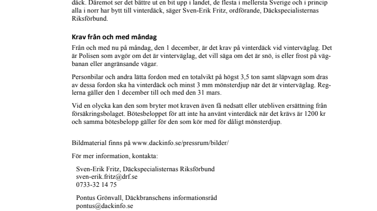 Från och med nu på måndag, den 1 december, är det krav på vinterdäck vid vinterväglag. Det är Polisen som avgör om det är vinterväglag, det vill säga om det är snö, is eller frost på vägbanan eller angränsande vägar. Personbilar och andra lätta fordon med en totalvikt på högst 3,5 ton samt släpvagn som dras av dessa fordon ska ha vinterdäck och minst 3 mm mönsterdjup när det är vinterväglag. Reglerna gäller den 1 december till och med den 31 mars.