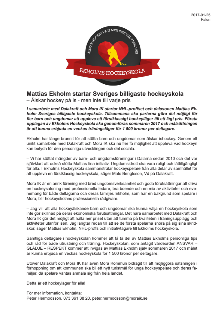 I samarbete med Dalakraft och Mora IK startar NHL-proffset och dalasonen Mattias Ekholm Sveriges billigaste hockeyskola.