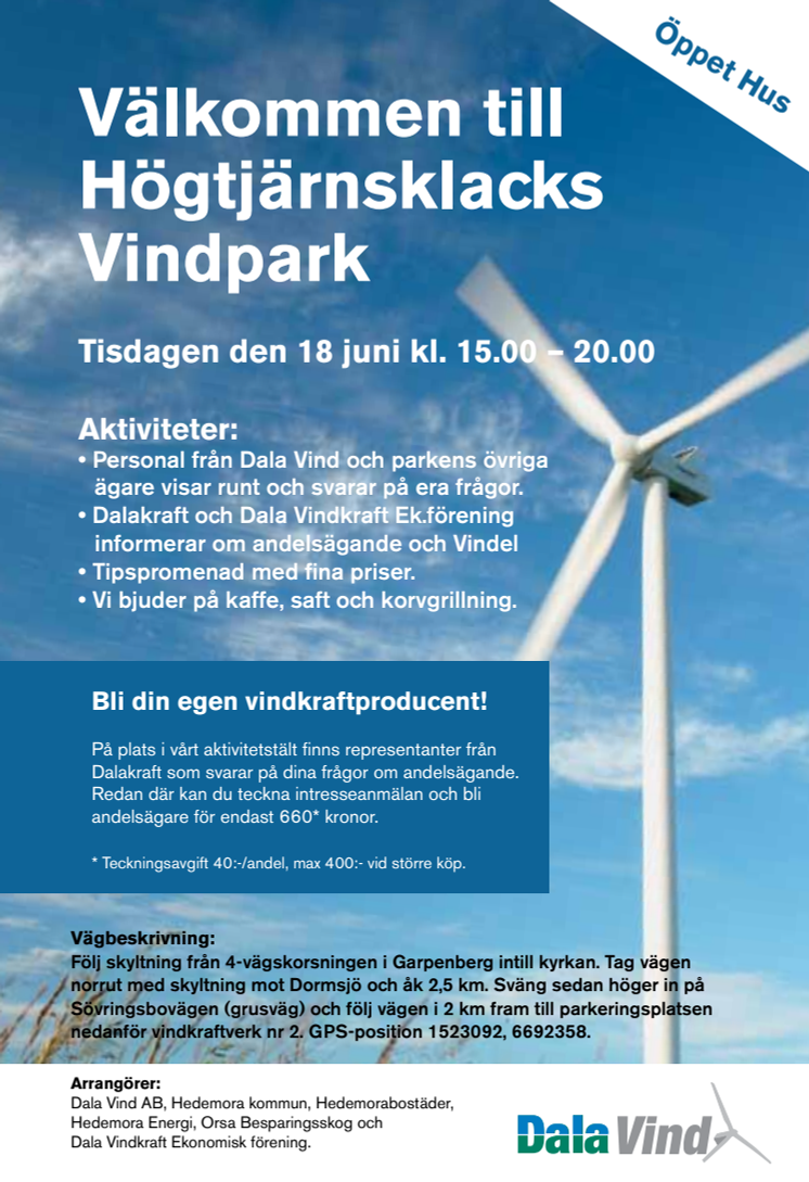 Dalakraft och Dala Vindkraft Ekonomisk förening finns också på plats för att informera om hur man blir andelsägare i vindkraftparken genom föreningen och vilka fördelar som det ger. Du kan teckna dig för vindandelar och bli delägare direkt på plats från 660:- per andel.