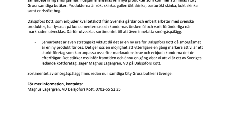 Skinka är ett av svenskarnas mest älskade smörgåspålägg och för att kunna erbjuda ett smörgåspålägg med riktigt fina svenska råvaror har City Gross och Dalsjöfors Kött ingått ett samarbete kring smörgåsmat. I dagarna lanseras fem nya produkter som kommer att finnas i City Gross samtliga butiker. Produkterna är rökt skinka, gallerrökt skinka, basturökt skinka, kokt skinka samt enrisrökt bog.