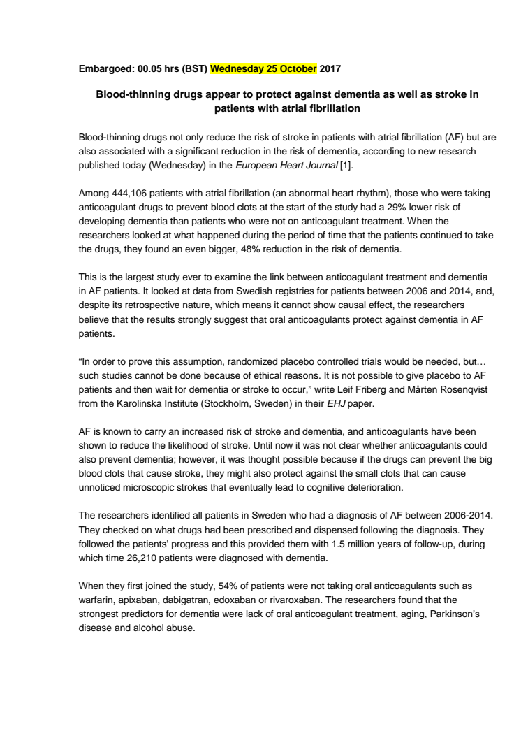 Blood-thinning drugs appear to protect against dementia as well as stroke in patients with atrial fibrillation