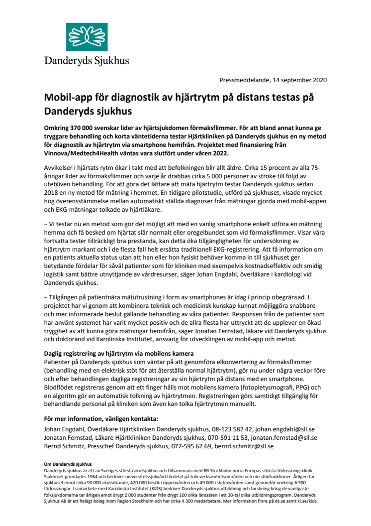 Omkring 370 000 svenskar lider av hjärtsjukdomen förmaksflimmer. För att bland annat kunna ge tryggare behandling och korta väntetiderna testar Hjärtkliniken på Danderyds sjukhus en ny metod för diagnostik av hjärtrytm via smartphone hemifrån. Projektet med finansiering från Vinnova/Medtech4Health väntas vara slutfört under våren 2022.