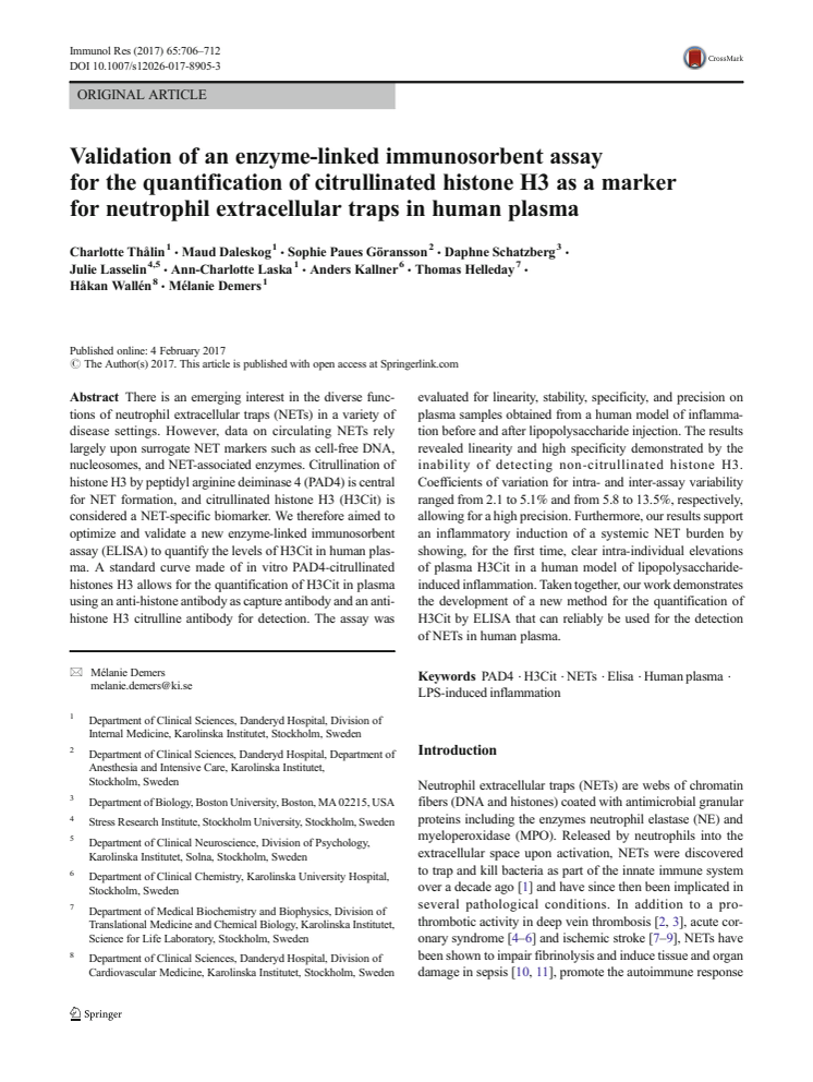 ”Validation of an enzyme-linked immunosorbent assay for the quantification of citrullinated histone H3 as a marker for neutrophil extracellular traps in human plasma.”