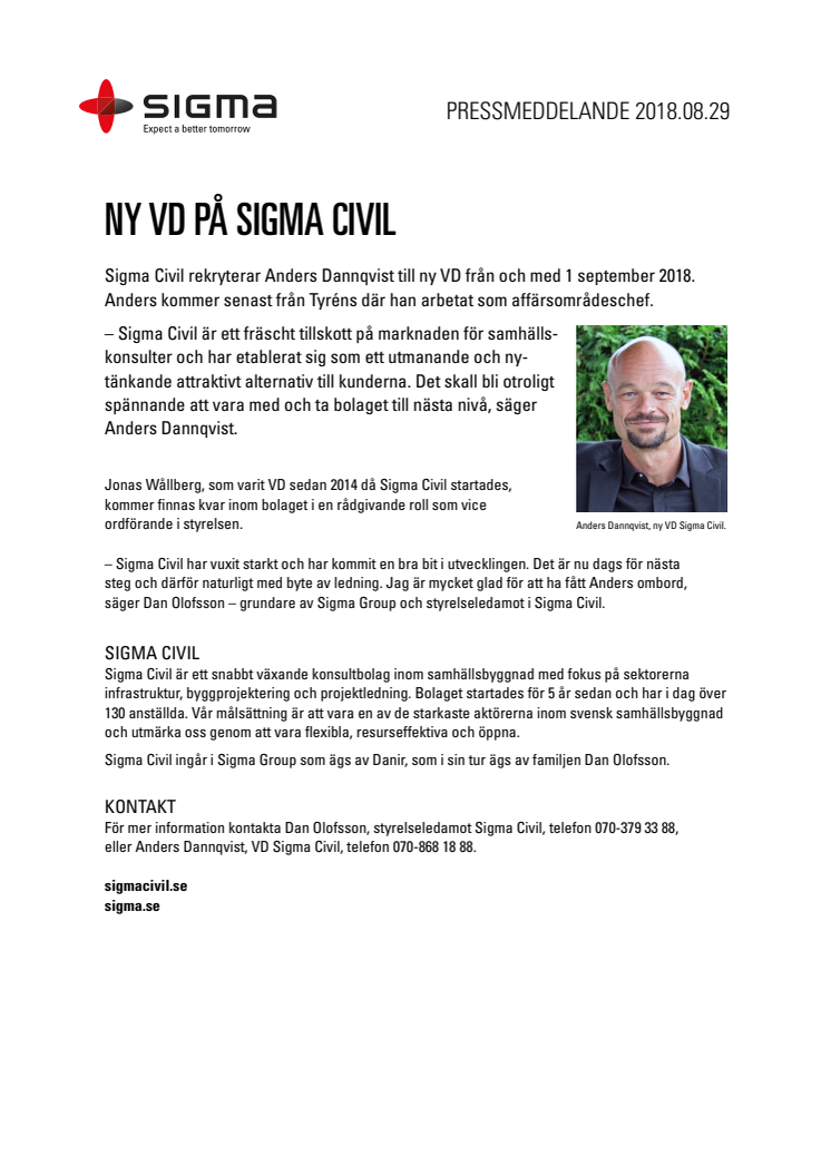 Sigma Civil rekryterar Anders Dannqvist till ny VD från och med 1 september 2018.