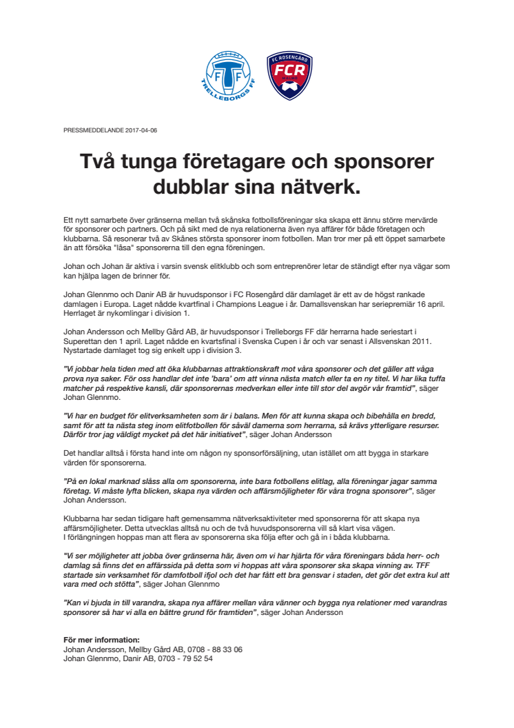 Ett nytt samarbete över gränserna mellan Trelleborgs FF och FC Rosengård ska skapa ett ännu större mervärde för sponsorer och partners. Och på sikt med de nya relationerna även nya affärer för både företagen och klubbarna. Så resonerar Johan Glennmo och Danir AB, huvudsponsor i FC Rosengård och Johan Andersson och Mellby Gård AB, huvudsponsor i Trelleborgs FF.