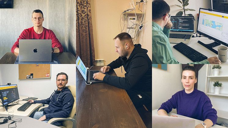 Swedes for Ukraine utvecklingsteam på Sigma Software: Dmytro Kapustianskyi, Artem Kostenko, Pavlo Shyian, Vladyslav Plotnyk och Vera Prokudina.