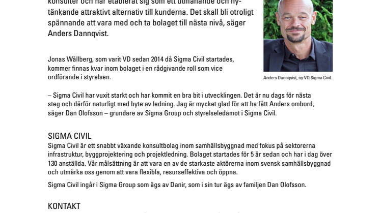 – Sigma Civil är ett fräscht tillskott på marknaden för samhällskonsulter och har etablerat sig som ett utmanande och nytänkande attraktivt alternativ till kunderna. Det skall bli otroligt spännande att vara med och ta bolaget till nästa nivå, säger Anders Dannqvist.