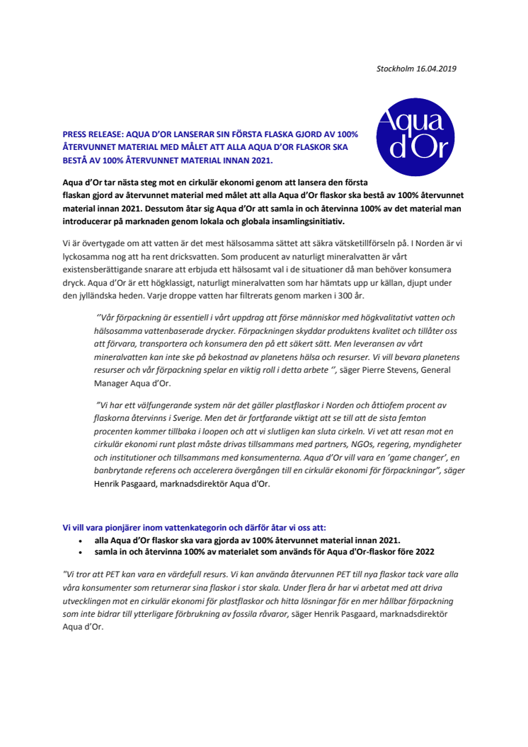Aqua d’Or tar nästa steg mot en cirkulär ekonomi genom att lansera den första flaskan gjord av återvunnet material med målet att alla Aqua d’Or flaskor ska bestå av 100% återvunnet material innan 2021. Dessutom åtar sig Aqua d’Or att samla in och återvinna 100% av det material man introducerar på marknaden genom lokala och globala insamlingsinitiativ.
