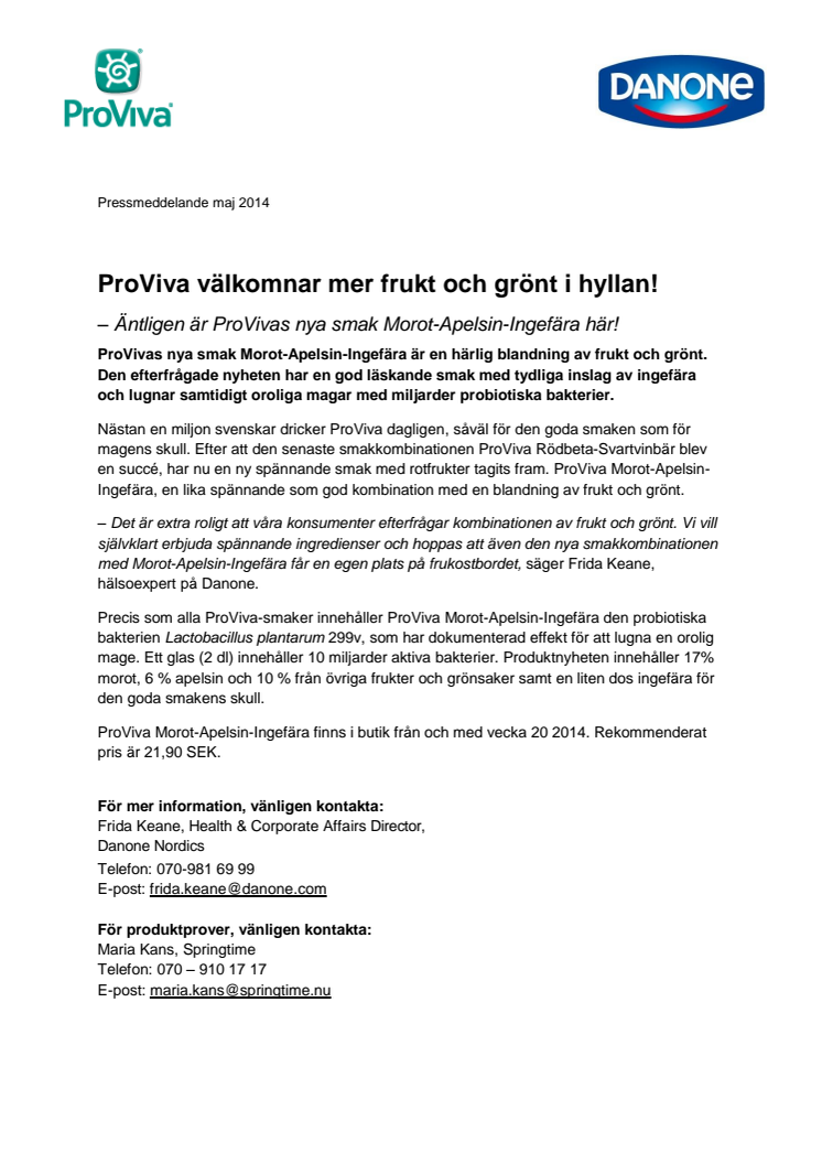 ProVivas nya smak Morot-Apelsin-Ingefära är en härlig blandning av frukt och grönt. Den efterfrågade nyheten har en god läskande smak med tydliga inslag av ingefära och lugnar samtidigt oroliga magar med miljarder probiotiska bakterier.