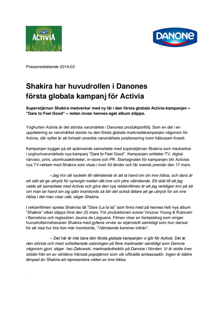 Superstjärnan Shakira medverkar med ny låt i den första globala Activia-kampanjen – ”Dare to Feel Good” – redan innan hennes eget album släpps.