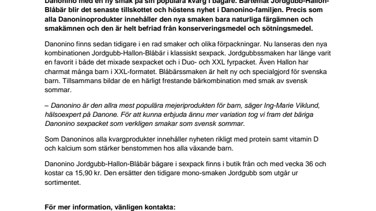 Lagom till skolstarten och höstens alla utflykter och mellanmålsstunder kommer Danonino med en ny smak på sin populära kvarg i bägare. Bärtemat Jordgubb-Hallon-Blåbär blir det senaste tillskottet och höstens nyhet i Danonino-familjen. Precis som alla Danoninoprodukter innehåller den nya smaken bara naturliga färgämnen och smakämnen och den är helt befriad från konserveringsmedel och sötningsmedel.