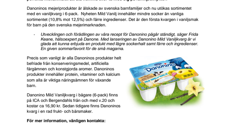 - Utvecklingen och förädlingen av våra recept för Danonino pågår ständigt, säger Frida Keane, hälsoexpert på Danone. Med lanseringen av Danonino Mild Vaniljkvarg är vi glada att kunna erbjuda en produkt med lägre sockerhalt samt färre och ingredienser. En given sommarfavorit för de små magarna.