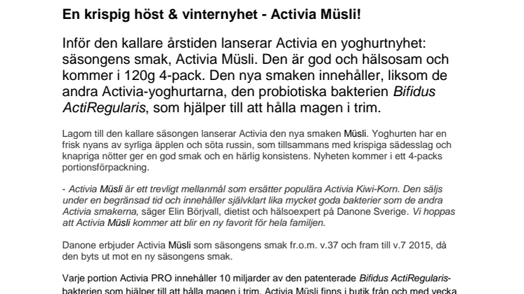 - Activia Müsli är ett trevligt mellanmål som ersätter populära Activia Kiwi-Korn. Den säljs under en begränsad tid och innehåller självklart lika mycket goda bakterier som de andra Activia smakerna, säger Elin Börjvall, dietist och hälsoexpert på Danone Sverige. Vi hoppas att Activia Müsli kommer att blir en ny favorit för hela familjen.