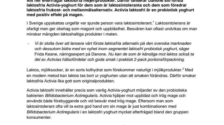- Vi är stolta över att lansera vårt första laktosfria alternativ på den svenska marknaden och dessutom bidra med en nyhet inom segmentet laktosfri probiotisk yoghurt, säger Frida Keane, näringsexpert på Danone. Nu kan de som är känsliga mot laktos också ta del av Activias hälsofördelar och goda smak i praktisk 2-pack portionsförpackning.