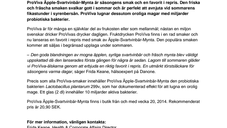 – Den goda blandningen av mogna äpplen, syrliga svartvinbär och fräsch mynta blev väldigt uppskattad då den lanserades första gången för några år sedan. Lagom till sommaren gläder vi ProViva-älskarna genom att erbjuda en riktig favorit i repris. En utmärkt törstsläckare för säsongens varma dagar, säger Frida Keane, hälsoexpert på Danone.