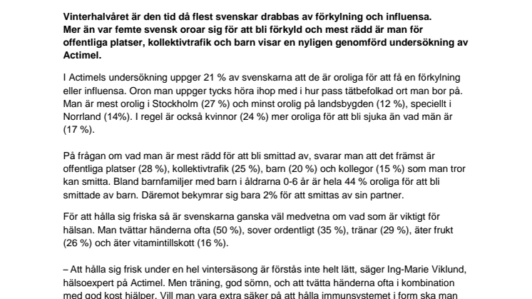 Vinterhalvåret är den tid då flest svenskar drabbas av förkylning och influensa. Mer än var femte svensk oroar sig för att bli förkyld och mest rädd är man för offentliga platser, kollektivtrafik och barn visar en nyligen genomförd undersökning av Actimel.