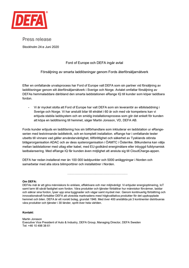 Ford of Europe har valt DEFA som sin partner vid försäljning av smarta laddlösningar genom sitt återförsäljarnätverk i Sverige och Norge.